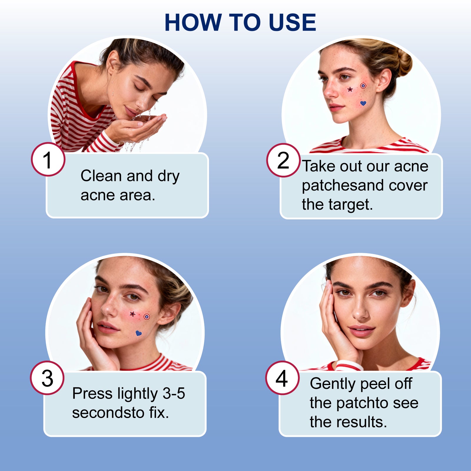 | 2️⃣ | Apply patch directly onto blemish—press edges firmly. |